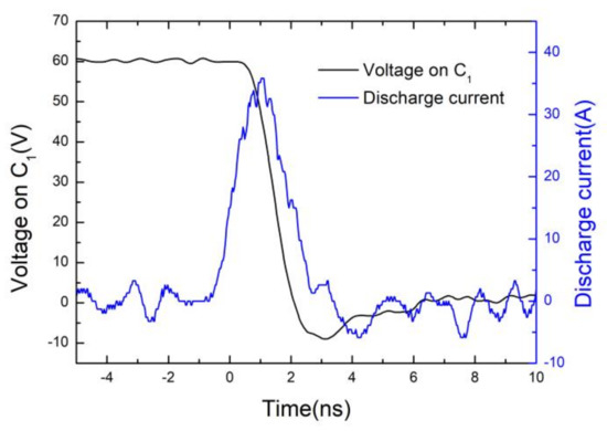 Figure 9 shows the voltage waveform measured on capacitor and the discharge current waveform obtained by differentiating the voltage waveform from (6). The input voltage was set as 30 V. of was set as 60 ns and the PPS was set as 1 kHz. The value of energy storage capacitor C1 was 1 nF.