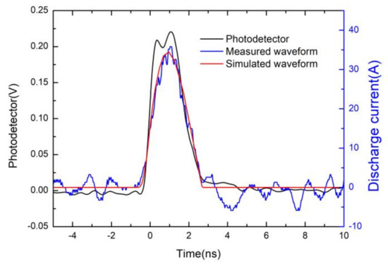 Theoretically, the shape of the emitted laser pulse waveform is consistent with the shape of the pulse current waveform passing through the laser diode. Figure 10 shows the comparison between the discharge current waveform obtained by differentiation and the laser pulse waveform detected by the photodetector. It can be seen that the pulse widths of the two waveforms are almost the same. Meanwhile, we measured the peak power of the laser pulse to be 121.1 W. Compared with the P-I diagram in the laser diode’s (SPL DS90A_3) datasheet, the maximum discharge current at this time should be about 35 A, which is similar to the discharge current waveform obtained by differentiation. Therefore, the discharge current waveform can be obtained by differentiating the voltage waveform on , and this measurement method is reliable.