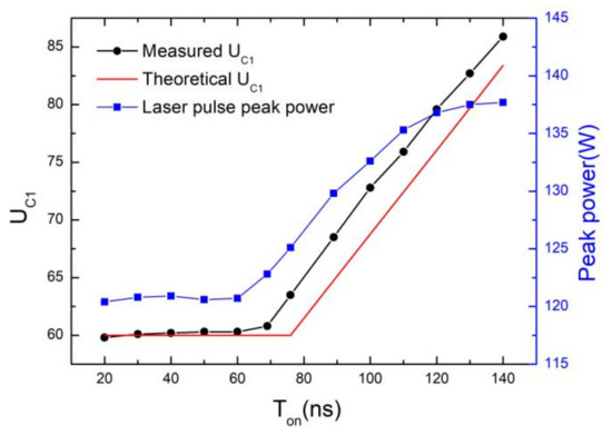 The input DC source voltage was set as 30 V and the PPS was set as 1 kHz. The discharge voltage on and the peak power of the laser pulse vary with the turn-on time of , as shown in Figure 15. When of is less than 60 ns, the maximum voltage on is almost unchanged, of course the peak power of the laser pulse also remains unchanged. When of exceeds 60 ns, the maximum voltage on will increase approximately linearly with the increase in . However, the increase in laser pulse peak power is nonlinear, mainly because the peak power of the laser pulse has exceeded 135 W, reaching the saturation power of the laser diode, and the power no longer increases.