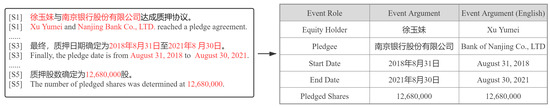 Table 1 shows the event ontology for five types of announcements: Equity Repurchase (ER), Equity Freeze (EF), Equity Underweight (EU), Equity Overweight (EO), and Equity Pledge (EP). The event ontology defines the event role information that needed to form a structured event, including two types of key roles and non-key roles. The key role is the necessary information to form an event, such as the Company Name and Repruchased Shares in ER. Without any key role, a complete structured event can not be formed.