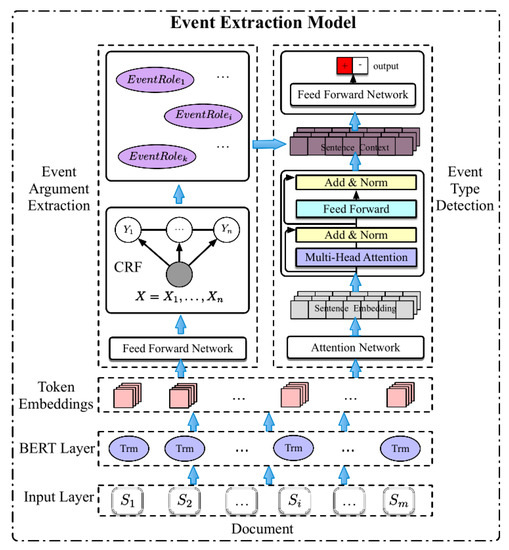 where represents the score of ground truth. The event argument extraction loss of the document is summation of the loss of all sentences. The event type detection model uses cross entropy denoted as to calculate the classification loss for each event type. Equation (10) shows the overall loss function of the event extraction model:
