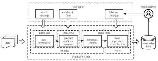 Fonduer is a machine learning-based knowledge base construction (KBC) system for richly formatted data, which uses the deep learning model to automatically capture the representation (i.e., features) [14]. Figure 3 presents the framework of construction of event knowledge base. The construction of the event knowledge base is mainly divided into three phases: data preprocessing, matching and filtering event candidate set by leveraging pre-defined rule-based matcher, and generating multimodal features for the candidate event set and training the weakly supervised classification model.