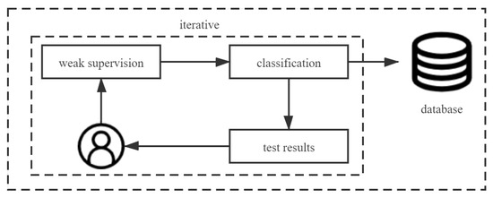As shown in Figure 4, in weakly supervised classification, the user first provides weakly supervised labels for the data by labeling functions and then uses the classification model to learn potential relationships from the manually labeled data, uses test data to verify the performance of model, and finally the user adjusts the marking function by observing the performance of model. Such process is iterative. A classification model with better performance will eventually be trained. After using this model to label all candidate events, a structured event knowledge base can be obtained. Here, the marking function is a data programming paradigm, which is to label candidate events in a programmatic way, namely, mark the candidate event as a positive/negative example or skip labeling.