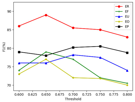 First, an experiment of threshold in the classification model is studied. Figure 7 shows the influence of classification threshold. It can be seen that (1) with same threshold 0.65, three types of events—ER, EF, and EO—have achieved the highest F1 score, and (2) EP has the worst performance under this threshold. Therefore, we use different thresholds for different types of events to maximize the performance of all models. After obtaining the best classification model, we further perform an experiment on five types of event to verify the quality of event labeling. As shown in Table 4, it can be observed that event labeling on ER have performance with 83.3% F1 score. The F1 scores on other three event types are a little lower than that on ER. This may owe to more noise brought by labeling function. In addition, simply increasing the number of labeling function cannot improve the quality of event labeling.