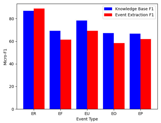 We compare the performance of the event extraction model under corresponding event knowledge base. As shown in Figure 8, the F1 score of knowledge base in ER is the highest, and the corresponding event extraction model has the best performance. Although EP is 4.2 times the size of ER in terms of dataset, the performances of knowledge base construction and event extraction model are lower than that of ER. Therefore, simply increasing the size of the corpus cannot effectively improve the performance of the model, and it is also necessary to improve the quality of knowledge base at the same time. EF and EP have very close performance of knowledge base, and their difference in the performance of the event extraction model between the two is less than 1%. EO and EF also have close performance of the knowledge base construction, but the performance of the event extraction model has a difference of 3%. Therefore, although different event types are close to each other in the performance of knowledge base construction, there may still be a large gap between the performance in event extraction model.