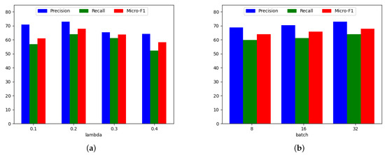 At the same time, in order to study the influence of hyperparameters in TDJEE model, we compared the P, R, and F1 scores with different hyperparameter and batch size. As shown in Figure 9a, when the value of is 0.2, the performance of the model is the highest, and when the values of are 0.3 and 0.4, the effect of the model shows a downward trend. As the input of the event extraction model is based on the document, the number of event arguments in the document is more than the event sentence. Therefore, the loss generated by the accumulation of event arguments is greater than that generated by event type detection, and a smaller value of can effectively balance the losses, thereby maximizing the performance.