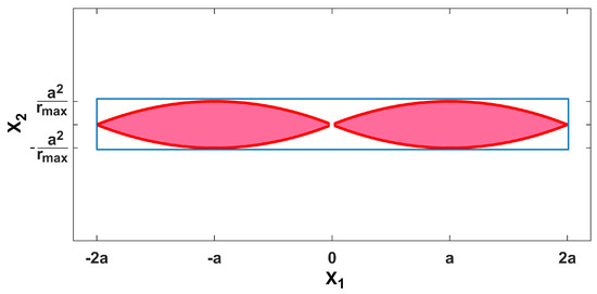 As seen from Figure 2, the integration domain is not rectangular. However, since the area of does not differ significantly from the area of the smallest rectangular that encloses , can be evaluated by integrating on the smallest rectangle that includes the set . The latter is made up by all the points belonging to the rectangular set .