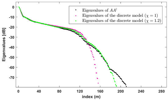 Figure 5 shows the eigenvalues of , and those of the correspondent discrete models obtained by using as sampling steps and . As can be seen from Figure 5, a sampling frequency exactly equal to the Nyquist rate is already sufficient to approximate the most important eigenvalues of ; instead, a sampling frequency higher than the Nyquist rate allows for also approximating the eigenvalues whose value is lower.