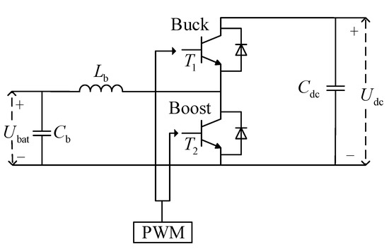 In islanded DC microgrids, the ESS plays an important role in suppressing power fluctuations in the microgrid. The bidirectional DC/DC converter connects the ESS with the DC bus, controls the charge or discharge of the energy storage battery, and completes the bidirectional flow of the energy. The bidirectional DC/DC converter is divided into isolated type and nonisolated type. The isolated bidirectional DC/DC converter can achieve a high voltage transformation ratio, but the cost is relatively high and the structure is complicated. The nonisolated bidirectional DC/DC converter has a simple structure and high reliability, and is suitable for use in ESSs in small microgrids. Common nonisolated bidirectional DC/DC converters include Buck/Boost bidirectional DC/DC converters, half-bridge bidirectional DC/DC converters, and Cuk bidirectional DC/DC converters. Buck/Boost bidirectional DC/DC converter has the advantages of simple structure, high efficiency, strong reliability and easy control. Therefore, this article chooses Buck/Boost bidirectional DC/DC converter to complete the charge and discharge control of the energy storage battery. The structure of Buck/Boost bidirectional DC/DC converter is shown in Figure 2.