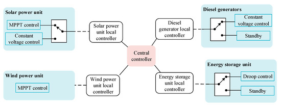 The device-level control mainly includes the control of the interface converters of distributed power sources, DC loads, and energy storage devices. The main control goal is that the local controller quickly controls the interface converters of each unit according to the instructions issued by the central controller, completes the power balance in the islanded DC microgrid, maintains the stability of DC bus, and guarantees the power supply of microgrid. The device-level control method mainly includes the Maximum Power Point Tracking (MPPT) control of solar power generation units and wind power generation units, the constant voltage control (CVC) of solar power generation units and diesel generators, and the charge and discharge control of ESUs in energy storage devices. The device-level control structure is shown in Figure 9.