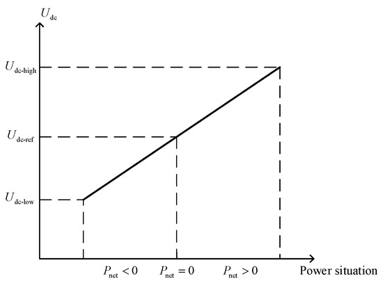 In islanded DC microgrid, because the DC bus is used to transmit electric energy, there is no need to consider the problem of reactive power, so the DC bus voltage can directly reflect the power situation in the microgrid [29]. The corresponding situation for power and bus voltage in an islanded DC microgrid is shown in Figure 10.