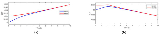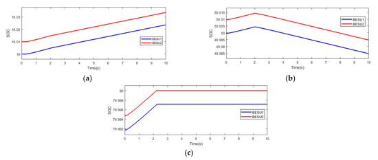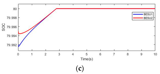 It can be seen from Figure 12a and Figure 13a that when the SOC of the ESU is lower than 20%, the ESU can only be charged. It can be seen from Figure 12b and Figure 13b that when the SOC of the ESU is in the range of 20–80%, the ESU can be charged and discharged. It can be seen from Figure 12c and Figure 13c that when the SOC of the ESU is greater than 80%, the ESU cannot continue to be charged and the ESS is in a standby state. Comparing Figure 12 and Figure 13, it can be concluded that the use of an ESS control strategy based on the SOC of the ESU can achieve the SOC balance of the ESU, thereby avoiding the exit of the ESS caused by a single ESU reaching the SOC threshold in advance.