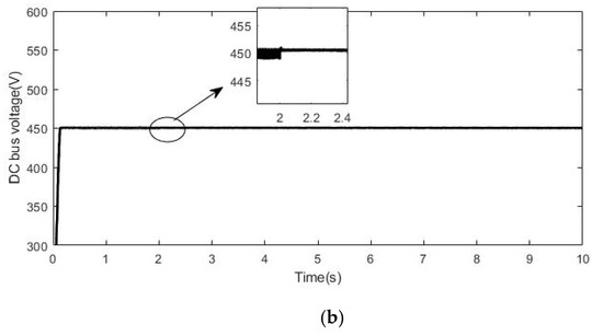 In Figure 10, is the reference value of the bus voltage. In this paper, the reference value of the bus voltage is set to 450 V, and is the allowable fluctuation range of the bus voltage. According to the requirements of the allowable deviation of the supply voltage, the DC bus voltage deviation range is the DC bus reference 7% of the value.
