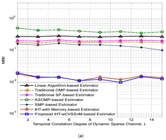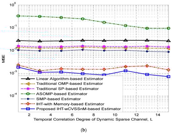 The initial set of results are illustrated in Figure 2 and show achievable comparative MSE performance of the proposed IHT-wCVSSnM-based estimator and other estimators while, the degree of temporal correlation of the time-varying sparse channel, is set at 8. Both the proposed IHT-wCVSSnM-based estimator and the IHT-wM-based estimator of [37] perform exceptionally well with all the other estimators. However, at the higher signal to noise ratio (SNR), the proposed IHT-wCVSSnM-based estimator outperforms its counterpart, the IHT-wM-based estimator of [37]. In Figure 3, the performances of all the estimators are evaluated when the temporal correlation degree of the dynamic channel (L) varies between 2 and 14. The performances are evaluated at both SNR of 5 dB and SNR of 15 dB. The corresponding results are illustrated in both Figure 3a,b, respectively. Most of the estimators exhibit constant MSE performance as the value of increases at SNR of 5 dB. Slightly improved MSE performances can be observed in both the proposed IHT-wCVSSnM-based estimator and the IHT-wM-based estimator of [37]. The results at SNR = 15 dB, however, suggest that only the A-SOMP-based estimator of [19] seems to be significantly improved by increasing the value of . Nonetheless, it shows the poorest performance, whereas the proposed IHT-wCVSSnM-based estimator shows the best performance with slightly improved performance as the value of increases from 2 to 14.