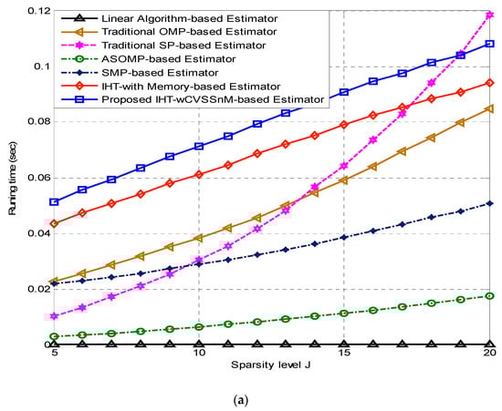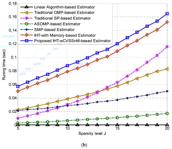 In terms of computational complexity cost requirements of each of the considered estimators and the proposed IHT-wCVSSnM-based estimator, the linear estimator of [41] exhibits the least computational complexity cost of order , the conventional OMP-based estimator involves complexity cost of , conventional SP-based estimator requires computational complexity cost of . The ASOMP-based estimator involves the computational complexity cost of about while the SMP-based estimator requires the complexity cost of . The IHT-wM-based estimator of [37] requires computational complexity cost of order , and the proposed IHT-wCVSSnM-based estimator’s operation requires computational complexity cost of order . To quantify the effects of computational complexities on the proposed estimator and other estimators in terms of the time to computation, CPU running time for all the estimators is obtained and illustrated in Figure 4. Figure 4a illustrates the running time results when the SNR is at 5 dB; and when the SNR is set at 15 B, the corresponding results are shown in Figure 4b. In these two results, it is obvious that the proposed IHT-wCVSSnM-based estimator requires more time for computations (including computations of both variable step size and momentum parameter) than all the other estimators. Its computational complexity cost is also slightly higher than its closely performing counterpart, the IHT-wM-based estimator of [37]. In the scenario where the dynamic sparse channel estimation is executed at the base station (BS), the slightly higher computational complexity cost of the proposed IHT-wCVSSnM-based estimator will be immaterial. This is because the performance is of high priority at this instance. Hence, the additional computational complexity cost can be borne at the BS. If the channel estimation is performed at the user equipment, the higher computational complexity will be undesirable. However, such high computational complexity cost can be easily accommodated due to the current advancement in the integrated circuit (IC)’s developments. This will allow high priority to be placed on the overall system’s performance to enhance users’ experiences.