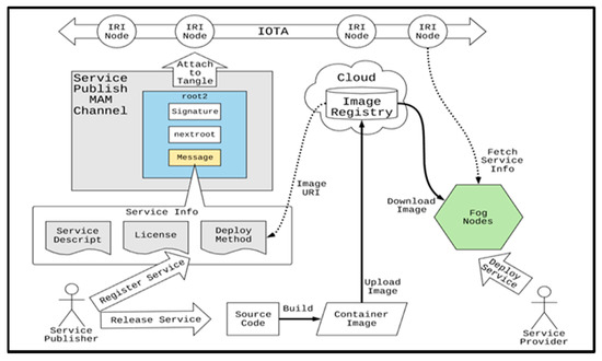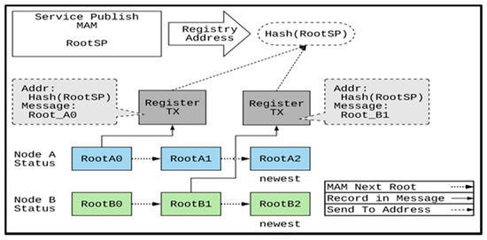 On the other hand, MAM uses a bundle of transactions to release information. Each bundle contains a W-OTS signature, the Root of the next message, and the released information. The transaction address can be Root or the Hash value of Root according to different MAM modes. Service publishers can register a service through MAM. The Root of the MAM message is the identification code of the service. The signature is used to prevent others from forging it. Similarly, fog nodes also release their node information through MAM, including the service URI and a service identification code list used to record the providing services, and continuously release the update of node information through the message chain’s characteristics.