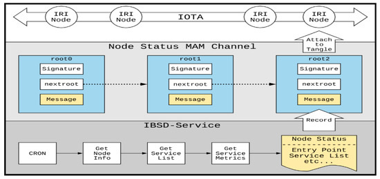 The IBSD service composition is a collection of services required to implement the IBSD mechanism. According to different functions, it can be divided into categories such as sending transactions, sending information, receiving transactions, receiving information, node status, system management, and service discovery. Through the information release mechanism described in Section 3.4 and the registration and indexing mechanisms mentioned in Section 3.5, fog nodes can exchange status information with one another through the IOTA distributed ledger technology. In IBSD, the fog node pays attention to the information of other nodes with the same service. The mechanism is as shown in Figure 9.