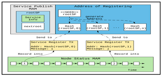 This research adopts the registration of service nodes for enabling clients to obtain the status information of the service nodes from the service namespace. The service nodes send the MAM Root of the node status to the service releasing address, and then clients can search this address to find the information of the service nodes. However, the transactions on the IOTA network are stored for a long time. Even if a node has stopped providing a service, the transactions related to the node’s service registration information can still be queried by clients later. Therefore, a mechanism of invaliding the out-of-date information is necessary. Additionally, it may take a long time to search from the MAM Root to the latest status because the node status information is continuously released. This study proposes time-difference addressing and tree-based MAM (TBMAM) indexing for transaction searching to solve the previous problems.