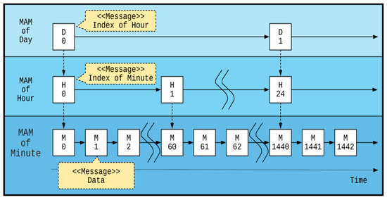MAM transactions are originally linked by a one-way indexing chain. If MAM transactions are used for recording time series data, the transaction-chain length continues to increase with time. It finally results in a long search range from the start index to the latest one. To speed up transaction searching, we implement a tree-based MAM indexing mechanism called TBMAM in this study. Through the hierarchical indexing chains for different time–length intervals, a tree-based indexing mechanism is formed, as shown in Figure 7. Assume that the frequency of transaction generation is one per minute. Every time 60 MAM transactions are released, the latest transaction address in the minute-level chain is added into the hour-level chain. Every time the addresses of 24 MAM transactions are added into the hour-level chain, the latest MAM transaction address in the hour-level chain is added to the day-level chain.
