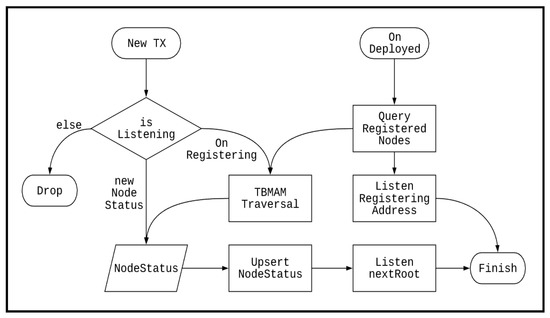 After the service deployment is completed, IBSD first queries the recent registration records of service nodes and adds the registered address to the monitoring list. For the service node registration transaction found, the TBMAM indexing is performed, and the latest node information is updated or added to the database. Finally, the nextRoot of the updated node status information is also added to the monitoring list. On the other hand, when IRI receives a new transaction, it checks whether the transaction address is in the monitoring list. If it is not, no process is performed. If it is, a new service node registration transaction is performed. Additionally, TBMAM indexing is performed to obtain the latest node status, and the database is updated to monitor the next sending address of MAM. If it is the new node status information, the database is updated, and the next sending address of MAM is monitored.
