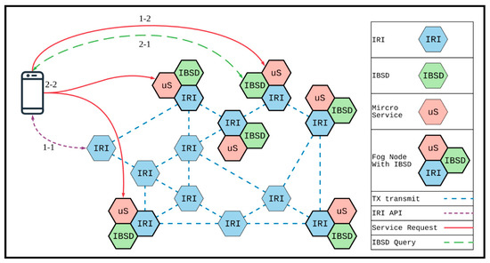The architecture of IBSD is shown in Figure 2. The inner components of a fog/edge node are IRI, IBSD services, and a microservice framework for operation. IRI is a node in the IOTA network. The fog node can send transactions through IRI and also receive transactions from other IRI nodes. In this study, the IBSD service combined with IRI was used to distribute the fog node’s service information to all IOTA nodes through transactions. The user applications can exploit IBSD-API to search for a service from any IRI node in the IOTA network and send a service request to the fog node that provides the service. On the other hand, the IBSD service also is used to monitor transactions sent by other fog nodes that provide the service, thereby maintaining a list of fog nodes for the same service. The user applications can obtain a complete list of fog nodes through IBSD-API to select the best service node by more detailed node information and obtain better service quality.