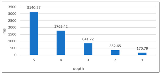 On the other hand, we evaluated the impact of TBMAM indexing on the cost of obtaining the newest node state information as follows. The length of the MAM transactions was set as 60. The hierarchical MAM index chains were constructed from the low level to the high level for 1, 3, 12, and 60 min. Additionally, we used a private IRI node without the limit of an API access number and the public IRI node provided by Tangle (https://nodes.thetangle.org:443, accessed on 3 June 2019), which has the limit of an API access number.