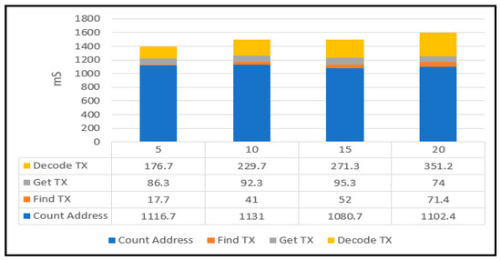 This experiment is aimed at measuring the cost of fetching and analyzing registration transactions and evaluating the impact of TBMAM indexing. First, we individually added 5, 10, 15, or 20 transactions at the same registered address and measured the fetching cost and analyzed a transaction by the registered address. Figure 15 shows the breakdown of transaction fetching and analysis. In the figure, Count Address denotes the cost of computing the registered address. The symbols of Find Tx and Get Tx represent the searching and fetching costs of a transaction. Decode Tx is the analysis cost of the transaction. The experimental result shows that Count Address (Hash function time) spends the most time cost. The cost of Find Tx and Get Tx is influenced by the IRI state rather than the number of transactions. By contrast, the cost of Decode Tx is increased as well as the number of transactions.