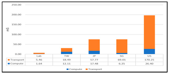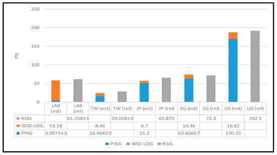 In this experiment, we deployed a simple computing service on two PCs in our lab and four virtual machines in the GCPs of different countries. Additionally, we ran an application to ask the deployed service about a client node (i.e., a PC in our lab). After the client node queried the IBSD node for the service nodes’ information, it obtained the recent execution time of each service node. Then, it estimated the network latency from the local to each service node through HTTP-ping and predicted the response time of each service node according to the execution time and network latency of the service node. Finally, it selected the node predicted with the lowest response time to be the service provider. The experimental result is shown in Figure 18. In this figure, the rel string represents real, and the est string denotes predicted. If the client considered only network latency, it would choose the PCs in our lab. By contrast, it would select the virtual machine in Japan’s GCP if it considered only execution time. However, it could choose the best node, which is virtual machines in Taiwan if it took both execution time and network latency into account. This result shows that the node selection mechanism indeed can help clients to obtain a better service quality.