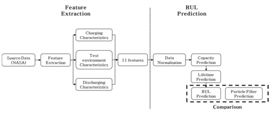 Other methods for RUL prediction include data analysis, model-based methods, and hybrid methods that combine data analysis and models [11,12,13,14]. Recently, data analysis has been more frequently used and involves acquiring and analyzing performance data that change over time according to the unique characteristics of the battery. Alternatively, physics-based methods rely on mathematical models to predict system deterioration [21,23]. Although mathematical modeling based on the analysis of the charge/discharge mechanisms can provide highly accurate and interpretable results, it is difficult to model large battery packs as opposed to single cells, and environmental variables cannot be reflected in the model even if interlock circuits and automatic control are considered [10]. RUL prediction using filtering, a statistical technique, has recently attracted research attention [13,14]. For instance, the particle filter (PF) [13], which has been primarily used in the fields of control, location tracking, and pattern recognition, has been recently used for battery RUL prediction.