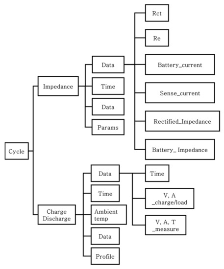 In this study, we used the charge and discharge test data obtained from the hardware testbed to train an RUL prediction model. The data comprised six datasets according to the experimental conditions and were classified considering the experiment end capacity, discharge current, discharge conditions, and experimental temperature. In addition to the charge and discharge voltage and current during the battery cycle testing, various types of data were included in each dataset, as shown in Figure 2. Although the measured impedance can indicate battery deterioration or aging, it was irregularly measured after various cycles and not in every cycle during data collection. On the other hand, although impedance can provide accurate predictions of battery aging, the battery must be separated from its host system, and the electrochemical impedance spectrometer used for the measurements is costly. In this study, we aimed to avoid expensive equipment for determining battery deterioration and instead use only data that can be collected during charge and discharge from all the battery data that can be collected during the operation of an electric vehicle to achieve RUL prediction.