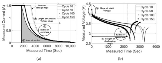 Extraction of geometric features from curves of (a) current during charge and (b) voltage during discharge.