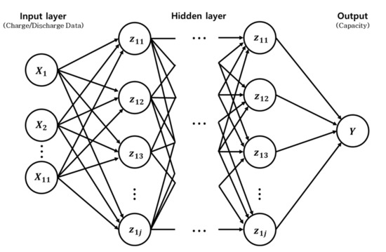 Energy storage devices (i.e., batteries) for electric vehicles (EVs) are among the most expensive components and are essential for supplying the energy required to drive these vehicles. A malfunction of batteries and their reduced lifetime that hinders an adequate energy supply to drive the vehicle may lead to accidents in the worst case. Accordingly, various approaches have been proposed to increase the lifetime of batteries while maintaining the size of a battery pack and protecting from electromagnetic interferences (EMIs) [1,2]. Such various efforts have improved the performance and safety of batteries used in electric vehicles, but there is still a possibility of malfunction at any time. Therefore, the deterioration of batteries supplying power to an EV must be continuously monitored [3]. Batteries are generally charged and discharged through repetitive electrochemical redox processes. Hence, it is difficult to accurately predict the remaining useful life (RUL) using theoretical models based on the mechanism of functional degradation by utilizing the data from experimental measurements of state of charge (SOC), state of health (SOH), and state of life (SOL) because of these nonlinear characteristics [4]. Moreover, the battery characteristics are determined by various features such as the microscopic structure of the active materials in the anode and cathode, as well as the operation environment, conditions, and frequency of use [5,6]. It is cumbersome to set the requirements according to the characteristics of the target applications. Therefore, various approaches are required to improve the battery management system (BMS).