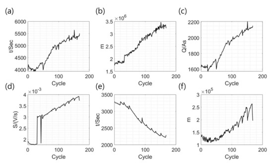 Geometric features (a–f) (defined in Figure 4) extracted from charge/discharge curves of battery B0005.