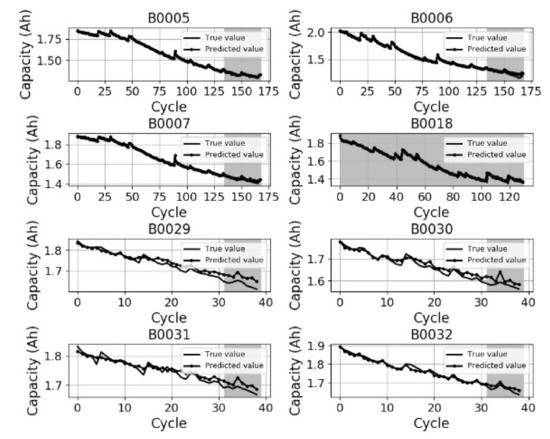 We confirmed that the prediction error differed depending on the battery used for training and testing. Therefore, we obtained the error based on the battery data used for training and testing. Table 2 lists the training and prediction test errors (e.g., root mean-squared error (RMSE)) obtained using the process proposed in this study. Each training dataset consisted of the remaining batteries, excluding one specific battery among all the battery data. That is, it shows the capacity prediction results performed after training on a dataset excluding a specific battery. The maximum and minimum training errors occurred for data from batteries B0018 and B0007, respectively, and the maximum and minimum test errors were obtained for B0032 and B0018 batteries, respectively. The average prediction error of battery capacity was 3.40 × 10−4 for test data of battery B0018, which had the smallest average error. The sum of the mean-squared errors of the predicted capacities of various batteries was 13.69 × 10-3, which was the smallest when the data of the B0018 battery was selected as the test data. The average prediction error of battery capacity was 3.40 × 10−4 for test data of battery B0018, which had the smallest average error. Therefore, the capacity prediction results may vary according to the characteristics of the training data.