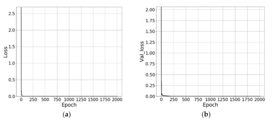 where n is the number of data points, yi is the output from the DNN, and ti is the corresponding measurement. As shown in Figure 8, the training and test errors decreased throughout the training and converged close to zero (9.01 × 10−5 and 1.07 × 10−4, respectively).