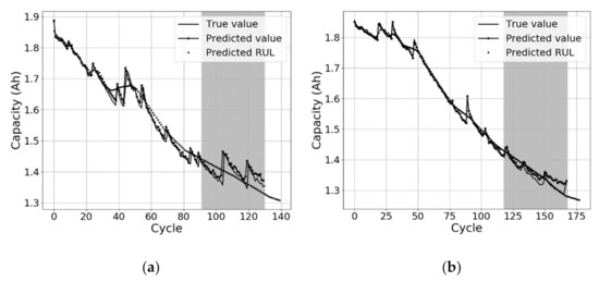 RUL prediction based using the DNN model for batteries (a) B0018 and (b) B0005.