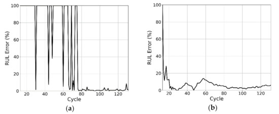 End of life (EOL) prediction error using (a) DNN and (b) particle filter (PF).