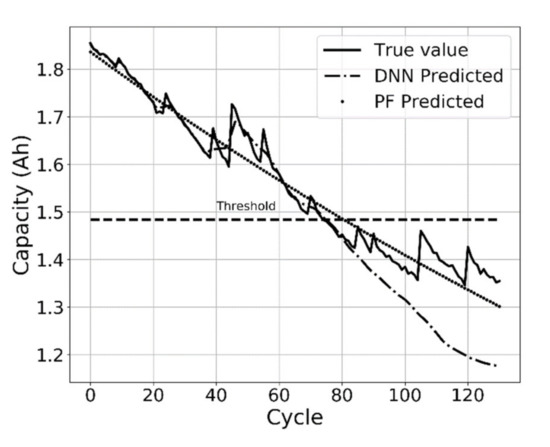 The EOL cycle based on the cycle testing data of battery B0018 is the 75th cycle. At the 13th cycle, that is, 10% of the cycles, we performed DNN training and PF modeling for prediction. The predicted EOL cycle using the DNN showed an overall error of 45.7%, which rapidly dropped to 1.1% after 76 cycles. Likewise, the predicted EOL cycle using the PF showed an overall error of 6.4%, which decreased to 3.7% at 76 cycles, which is when the DNN error rate decreases. Thus, using the proposed DNN, the EOL was predicted only when at least 80% of the tested battery data were available, while the PF could predict the EOL using initial data from less than eight cycles. An analysis of this result was performed to evaluate the utility of this algorithm during operation in real-time, assuming that there is no total capacity data. For learning-based algorithms, it can be understood that obtaining a certain amount of prior data has a great effect on improving accuracy. Figure 11 shows the results of the training and modeling capacities up to 76 cycles using the DNN and PF, respectively. The DNN accuracy depends on the data availability, whereas the PF can perform a suitable prediction even when only initial data are available, given the underlying model for prediction.