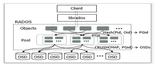 RADOS is an essential layer in Ceph [36]. It takes charge of mapping between clients and OSDs (Object Storage Daemons), which will be discussed further in Section 2.2. It is also responsible for replication and recovery such as replica management with strong consistency, self-healing, and dynamic cluster expansion. It supports a library, called librados, to the interface layer so that a client can interact with OSDs.