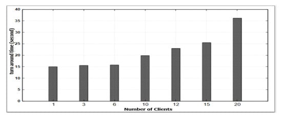 In this cluster, a benchmark program is used by a client. The program is a type of micro-benchmark that writes data for which the size is 20 MB to OSDs and reads it again from OSDs. To estimate the behavior of multiple clients, the programs are executed in parallel, from 1 to 20 as denoted in the x-axis of Figure 3. The y-axis is the average turnaround time of clients.