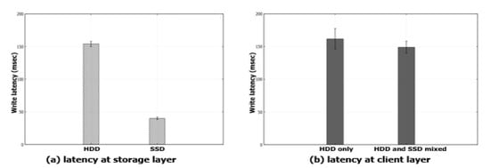Figure 4 presents our second observation. This experiment uses not only HDDs but also SSDs. Figure 4a shows the write latency observed at the storage layer, that is the elapsed time for writing 1 MB data measured at an OSD. It reveals that SSDs outperforms HDDs by more than 3 times. However, the write latency observed at the client layer, which is measured at a client node, does not exhibit such a performance improvement, as shown in Figure 4b.