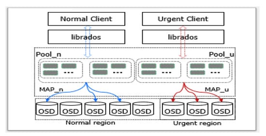 Specifically, for normal clients, it creates a pool, , with a CRUSH map, , that consists of OSDs in the normal region. Additionally, for urgent clients, it creates another pool, , with a CRUSH map, , consisting of OSDs in the urgent region. As the result, normal and urgent clients are isolated into different regions so that urgent clients are not interfered by normal clients. This mapping is called as an isolated mode.