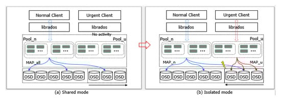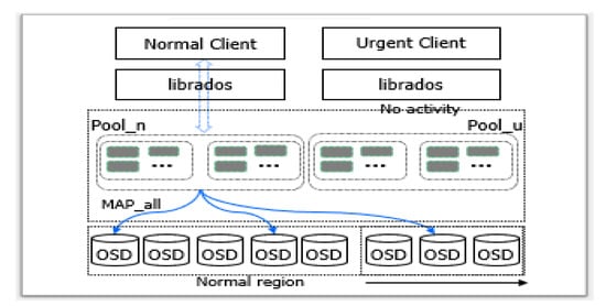 Although this isolated mode can prevent urgent clients from being interfered by normal users, it might lead to low storage utilization. Assume that the number of urgent clients decreases (or becomes zero). Then, maintaining OSDs for urgent clients is actually wasting storage bandwidth and space. In this case, it is better to reallocate them for normal clients. This paper designs a new mode, called shared mode, as shown in Figure 6, where uses instead of , which consists of all OSDs.