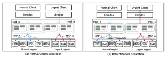 This paper examines two use cases of heterogeneous storage devices, normal/urgent and data/metadata separation, as shown in Figure 8. The normal/urgent separation is the case where relative faster devices (e.g., SSD or SCM (Storage Class Memory) [40]) is used for urgent clients while others are used for normal clients. This use case can provide guaranteed services for urgent clients and best-effort services for normal clients at an affordable price.