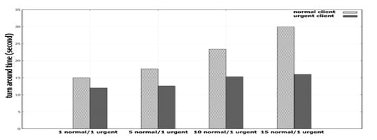 The results of Figure 9 demonstrate that our proposed scheme indeed guarantees the SLA requirement. The urgent client can obtain a turnaround time below the requirement even though the number of normal clients increases. Note that the original Ceph scheme violates this requirement when the number of clients is larger than 10, as observed in Figure 3, since it does not isolate between urgent and normal clients.