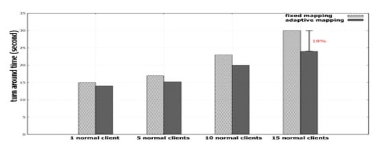 Figure 9 presents the evaluation results of our adaptive mapping scheme. This figure and Figure 3 are results of the same workload, except that the former uses our scheme while the latter uses the Ceph default scheme. In this experiment, an urgent client was defined as a client who requires a consistent turnaround time that can be obtained when it runs alone in our experimental cluster. Specifically, an urgent client makes an SLA contract that guarantees a turnaround time within 20 s. Clients who do not have such a requirement are treated as normal clients.