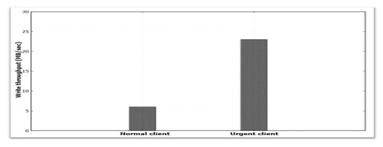 Note that the performance of the urgent client with one normal client is similar to that with 5 normal clients. However, with 10 or more clients, the performance of the urgent client becomes worse. Our analysis uncovers that this degradation is due to the contention of network, not in OSDs. Mroeover, experiments with increased numbers of urgent clients show that, for less than 5 urgent clients, our scheme can guarantee the SLA in our experimental cluster.