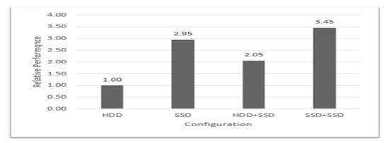 The results show that making an SSD-only cluster can enhance performance by up to 2.95 times, compared with a HDD-only cluster. Separating data and metadata into HDD and SSD can enhance performance around 2 times by reducing the metadata overhead. Utilizing two SSDs can enhance it further by exploiting parallelism between data and metadata processing.