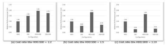 The performance per cost ratio under the four different configurations are given in Figure 13. There are three graphs in the figure with different cost ratios between HDDs and SSDs, namely 1 to 2, 1 to 5, and 1 to 10, respectively. When the cost ratio between HDDs and SSDs is small, an SSD-only cluster can be a feasible solution. However, when the ratio becomes larger, the data/metadata separation is the best solution in terms of the performance per cost.