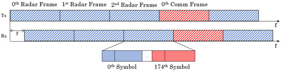 In RadCom systems, overall radio resources must be first shared between multiusers (multivehicles; hence the MA technique), and second between two functionalities, radar and communication. In the following sections, we adopted a time-division multiplexing (TDM) approach to separate both aspects of the RadCom system. TDM is a straightforward approach that we applied to the RadCom system by simply separating radar signals and communication signals over the time domain, as depicted in Figure 1. Priority in terms of resource allocation is evidently given to the radar rather than communication due to the need for continuous detection. Nevertheless, the transmitter is always able to communicate; for instance, if the vehicle changes the cell, it needs to send a communicating message to the base station (BS). The transmitter sends repeated frames in order to detect the neighboring vehicles. After a certain delay , it receives its reflected signal. This delay induced to the signal is inherently related to the application constrains, such as the radar’s maximal detection range. However, other users may send communicating messages to the main user, thus interfering with the reflected signal, and detection is degraded. The TDM approach mainly indicates to the main user if he is either on a communication or a radar time slot in order to trigger the proper (radar/communication) receiver to decode the frame. This approach decreases the overall complexity of the RadCom system by overcoming the need for interference cancellation techniques. We chose the time-sharing method because it is the simplest approach for radar or communication integration. The goal of this study is to evaluate our proposition in vehicular channels. In the future, we aim to study other sharing approaches, such as frequency sharing and Sub-beamy.